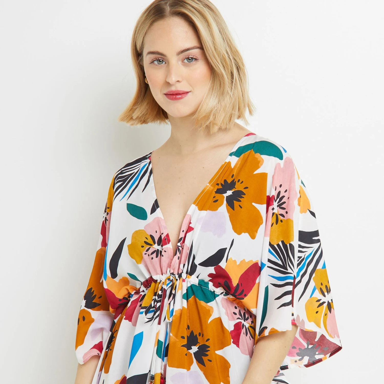 « La tunique d’été de rêve : colorée, cool, esprit vacances… surtout grâce à sa coupe ultra confort, facile et pratique à enfiler sur un maillot, et sa composition 100% viscose ecovero, conçue à partir de pulpe de bois issue des forêts durables. »