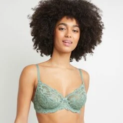 « Tant de légèreté et de romantisme en une parure d’inspiration végétale, fraîche et gracieuse. Une sublime dentelle ajourée conçue en fibres recyclées (40% minimum), une petite touche vintage et un coloris très printanier… un vrai bonheur. »